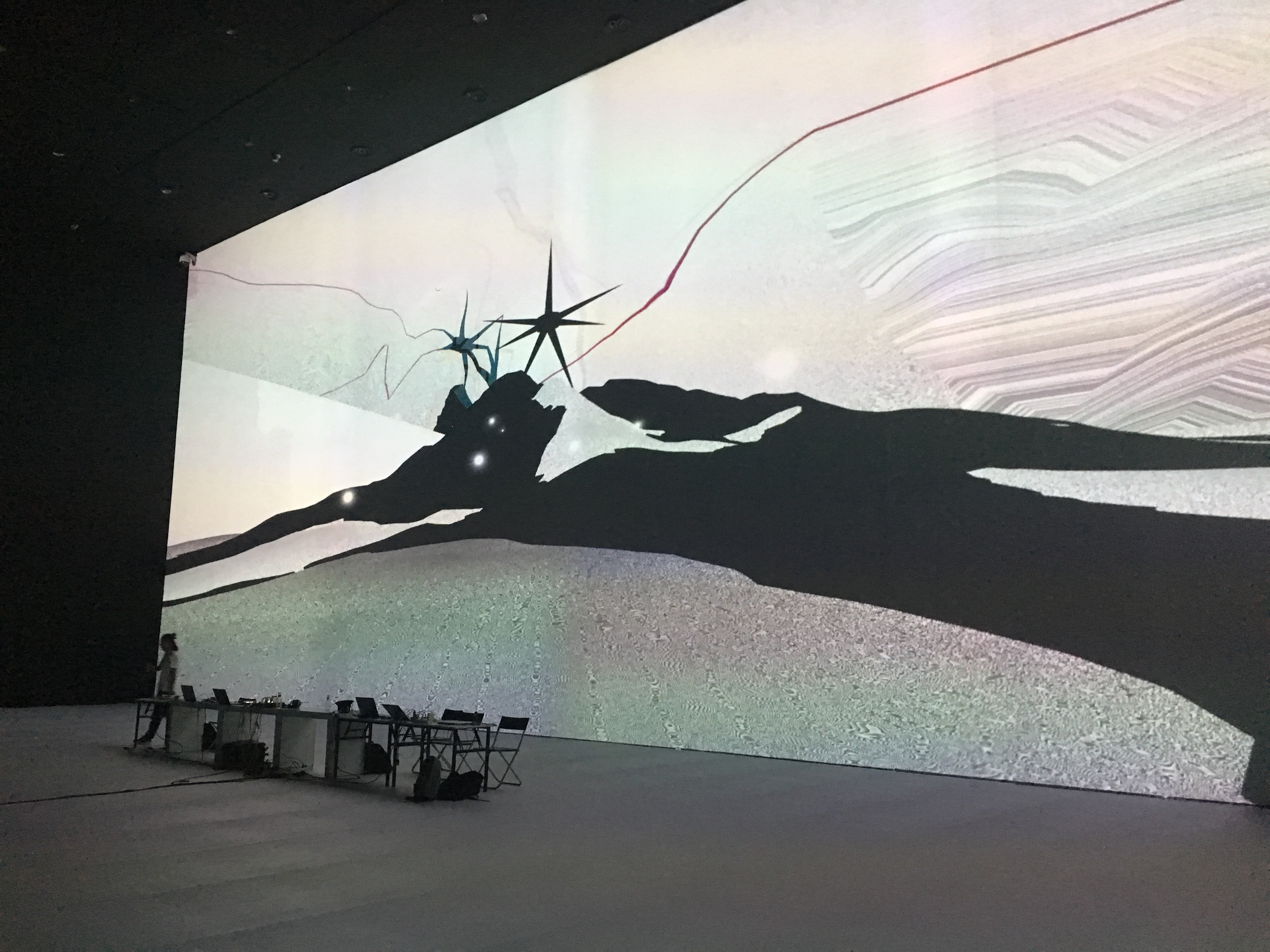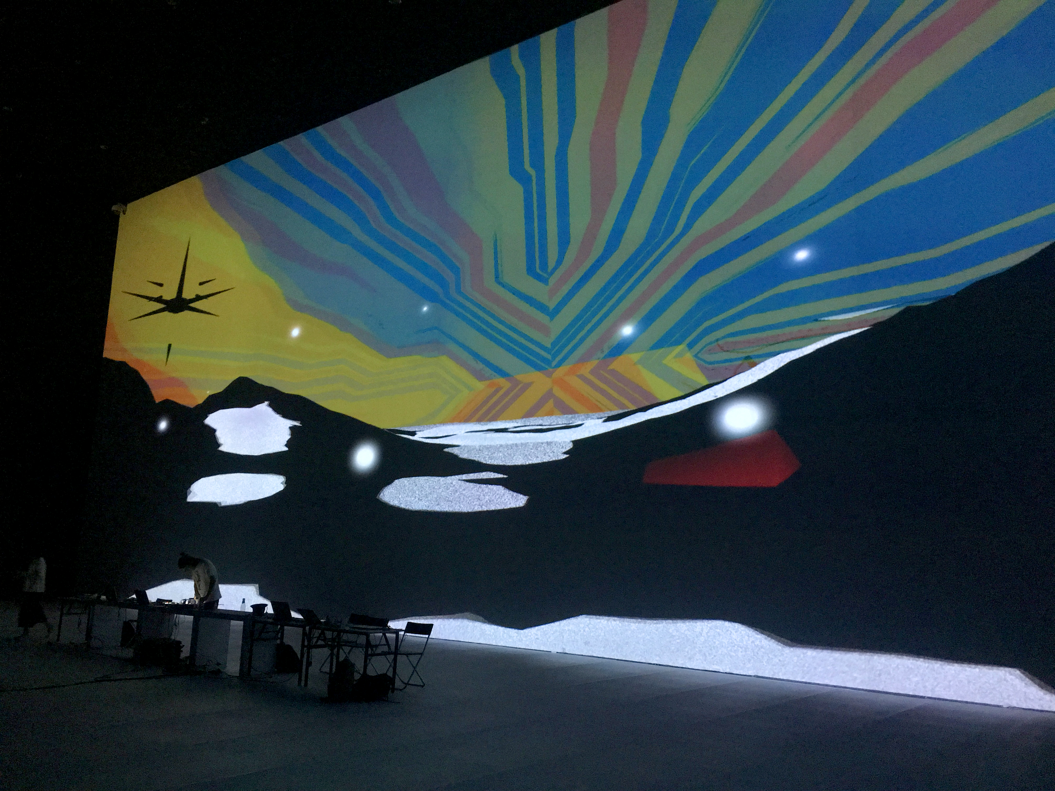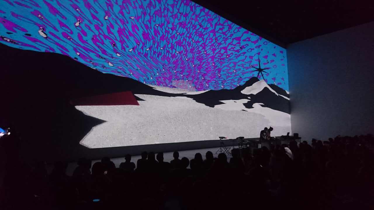 这次我和声音艺术家张安定 aka.Zafka一起合作。Zafka使用硬件合成器与采样器,呈现Live set的演奏,演奏的音乐氛围5个篇章。我负责视觉的呈现,视觉画面被投射在今日美术馆未来大厅的整面墙壁之上。